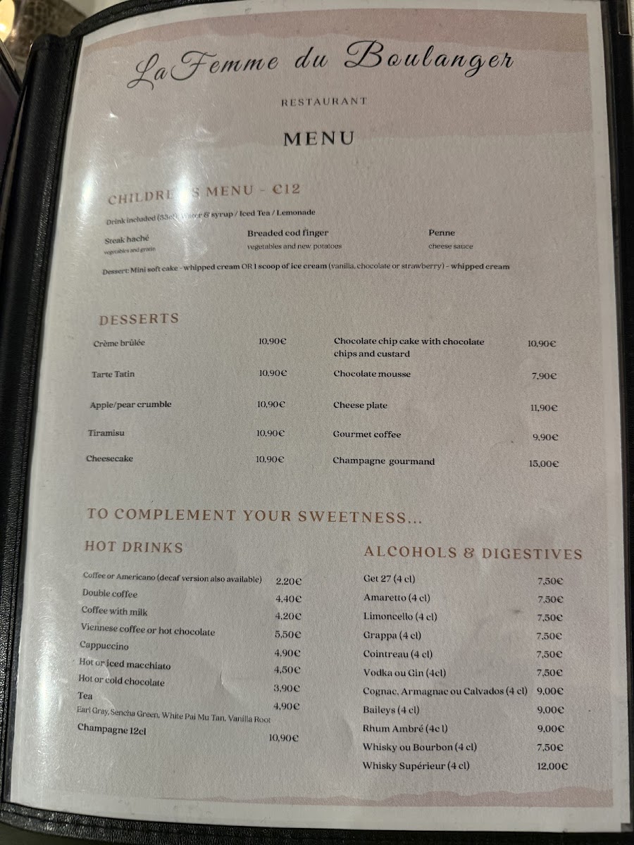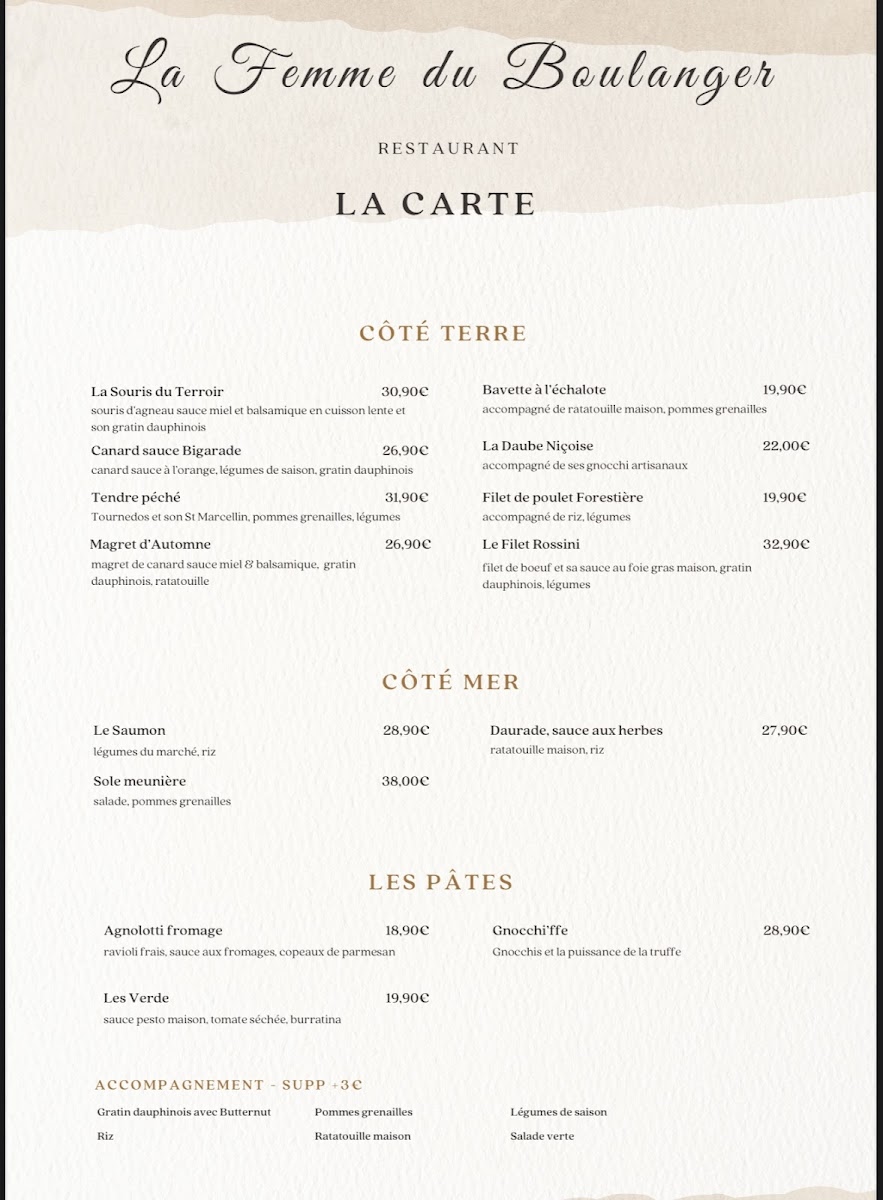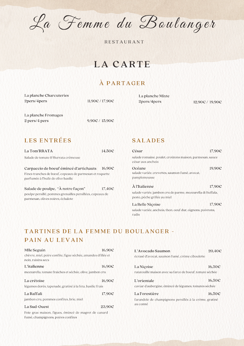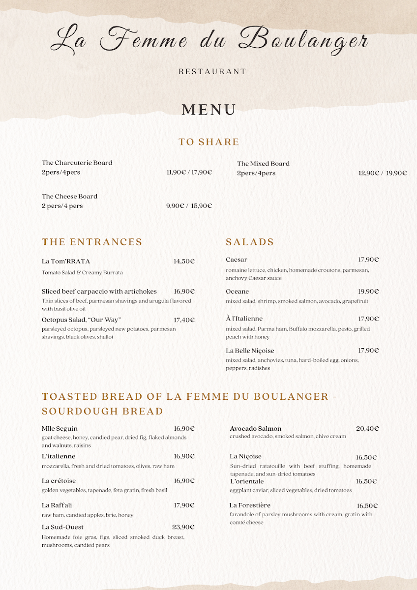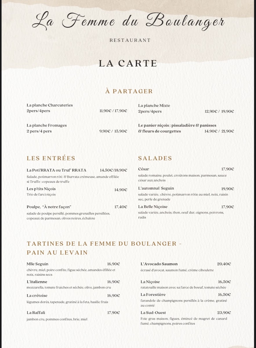 La Femme du Boulanger is a charming French restaurant nestled in the heart of Nice at 3 Rue du Commandant Raffalli. This cozy, inviting spot feels like a warm visit to grandma’s kitchen, where every dish tells a story. The menu artfully balances traditional and contemporary French cuisine, offering everything from brunch and petit déjeuner to shareable starters, fresh salads, and tartines. For main courses, diners can indulge in expertly prepared meat, fish, and pasta dishes that highlight seasonal ingredients.