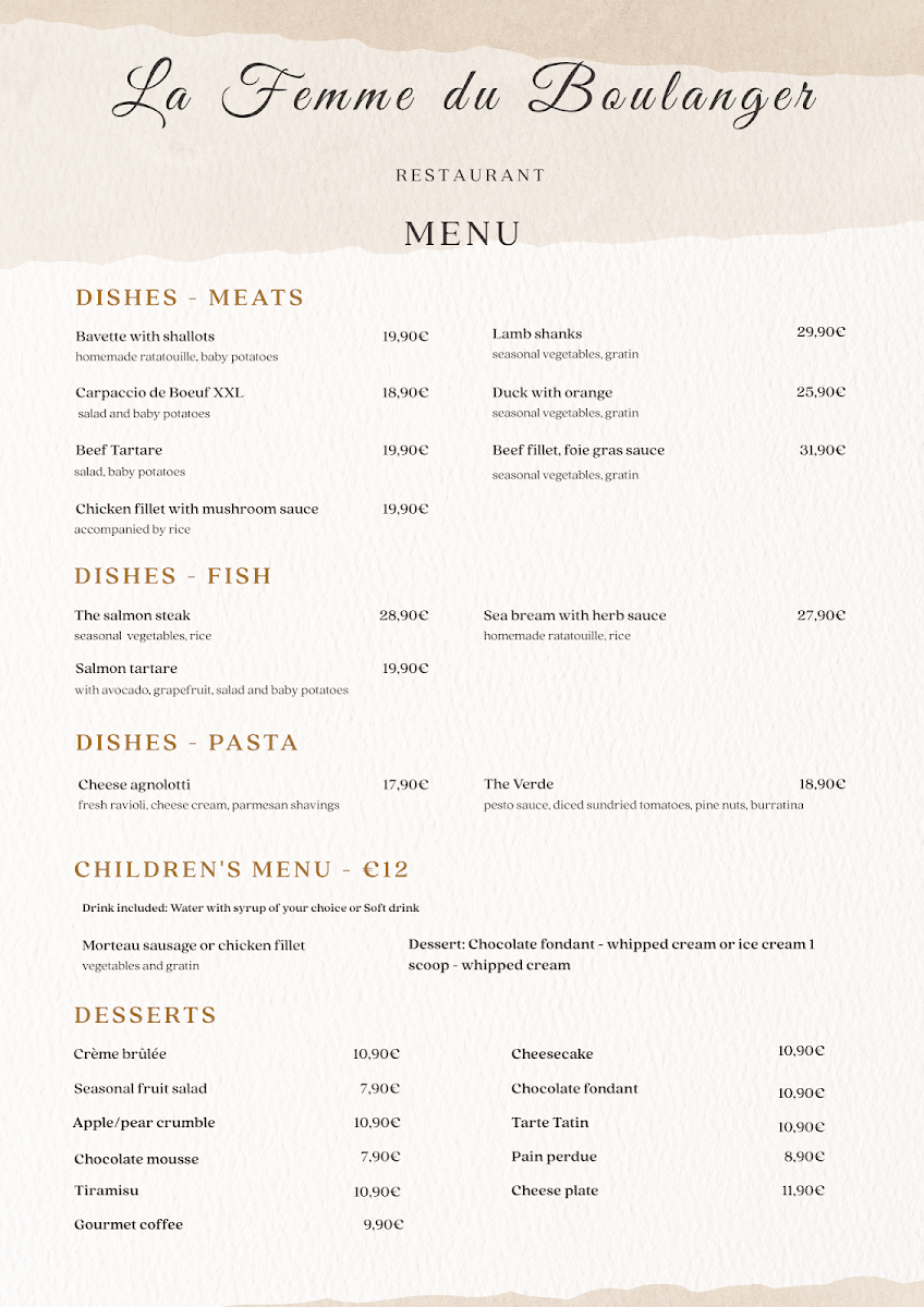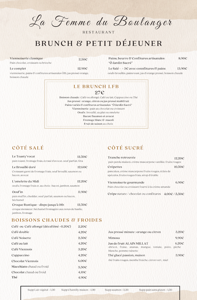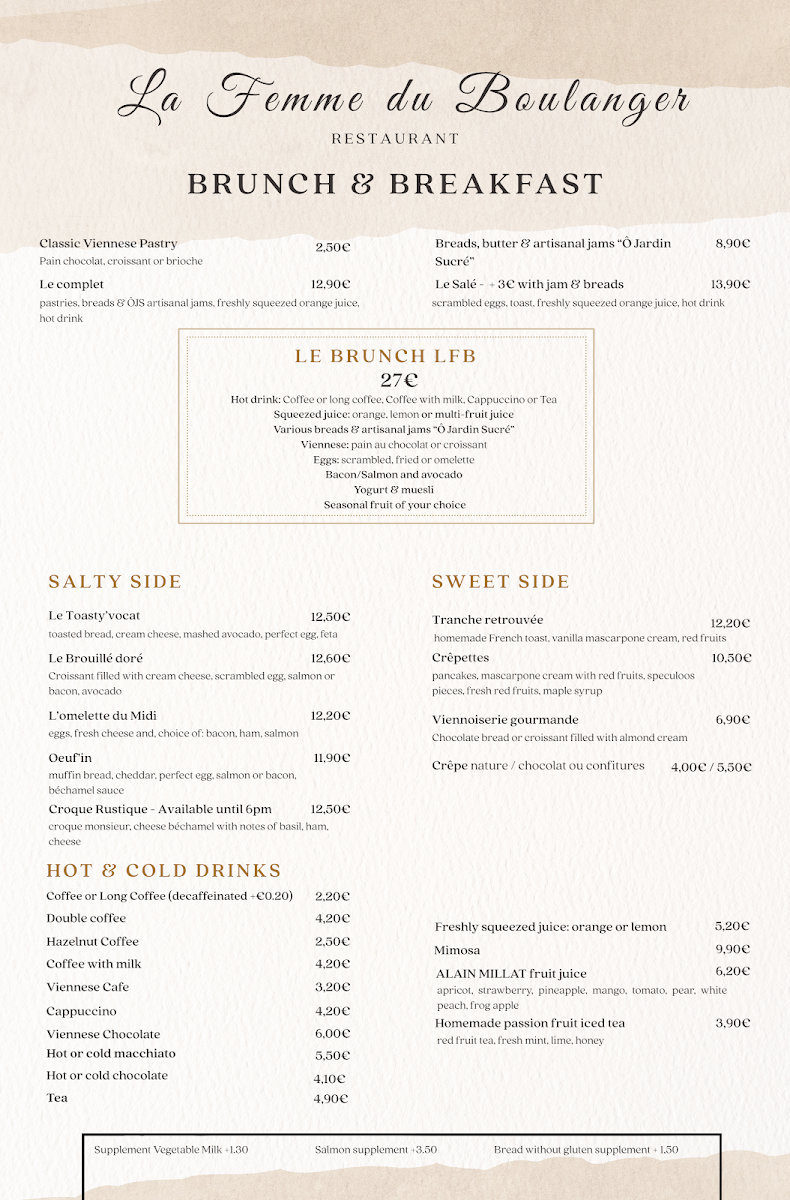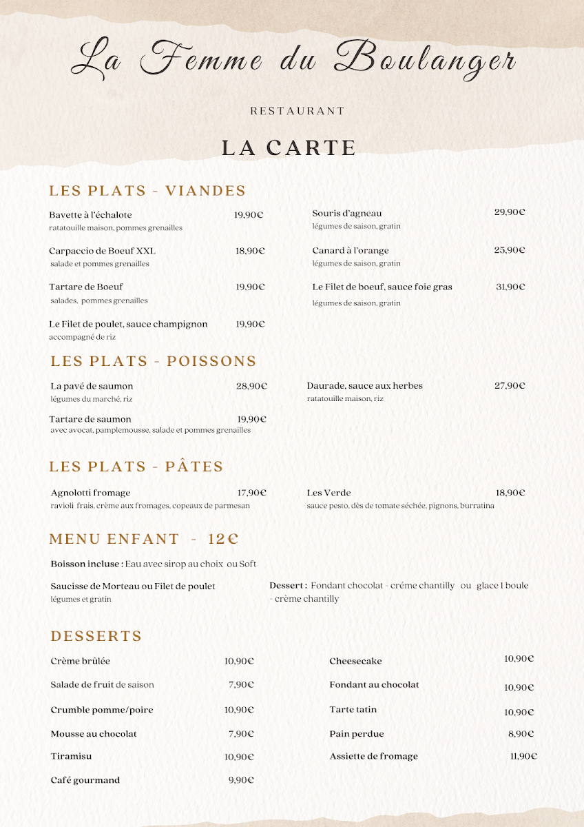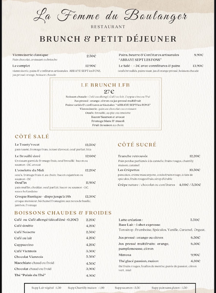 La Femme du Boulanger is a charming French restaurant nestled in the heart of Nice at 3 Rue du Commandant Raffalli. This cozy, inviting spot feels like a warm visit to grandma’s kitchen, where every dish tells a story. The menu artfully balances traditional and contemporary French cuisine, offering everything from brunch and petit déjeuner to shareable starters, fresh salads, and tartines. For main courses, diners can indulge in expertly prepared meat, fish, and pasta dishes that highlight seasonal ingredients.